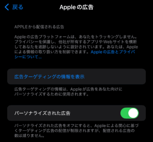 - [設定アプリ]-[プライバシーとセキュリティ]-[Appleの広告]-